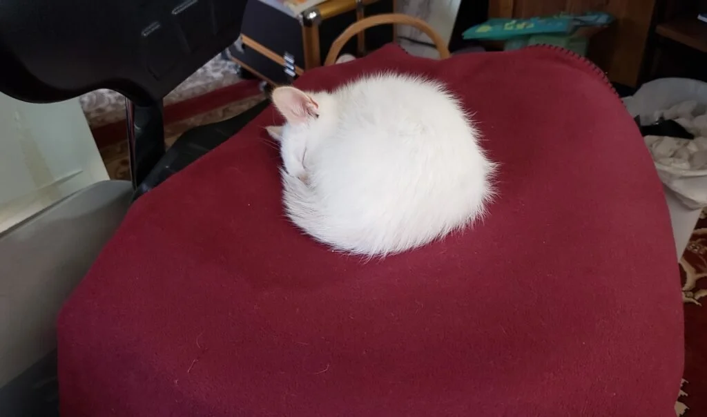 The big cats are Eric and Margaret. My favorite spot to sleep during the day is on the boy cat’s belly. He is so much warmer than the girl cat.