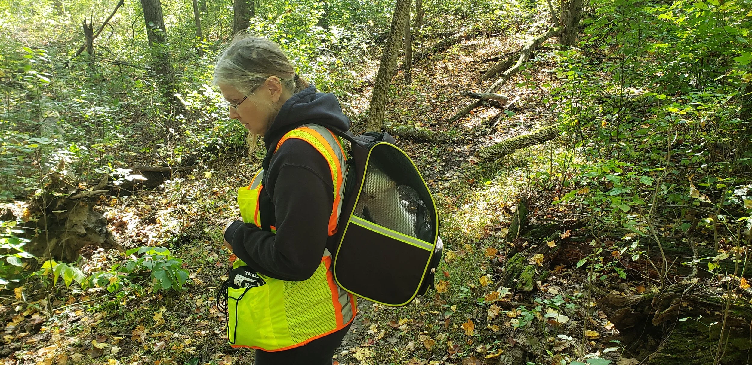 What? The pride is going to go foraging for mushrooms! Who does this? Guess I do now. We went into the trees and I was a bit worried. I rode in my backpack and got to see a lot of cool stuff, including a doggo.