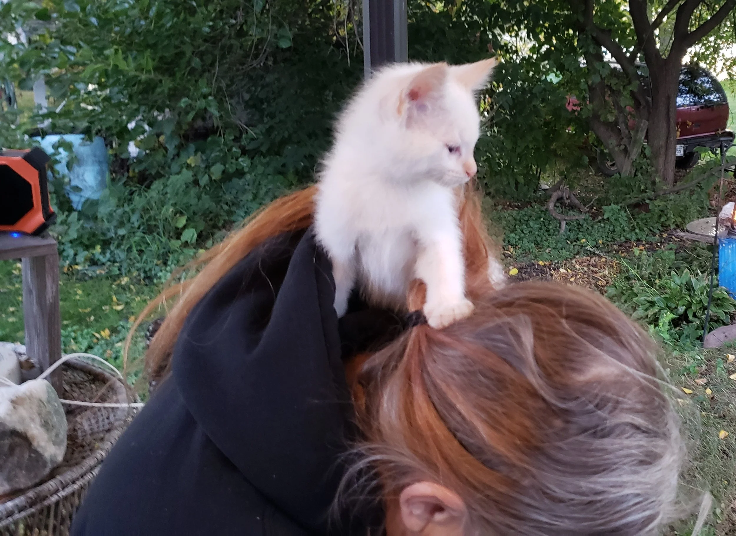 Then I got to hang out outside on the table in my box. Had to teach the box a couple of lessons. I did get out of my box as well but am not allowed to get on the ground by myself. (Too small). A hawk might get me, there was one flying around. Also, l got to meet Uncle (Owen), yes, I am going to call him Uncle too.