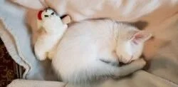 As you can tell, I am a short-haired white kitty with lightly toasted marshmallow ears and blue eyes. I am a Flame Point Siamese. (more on that another time)