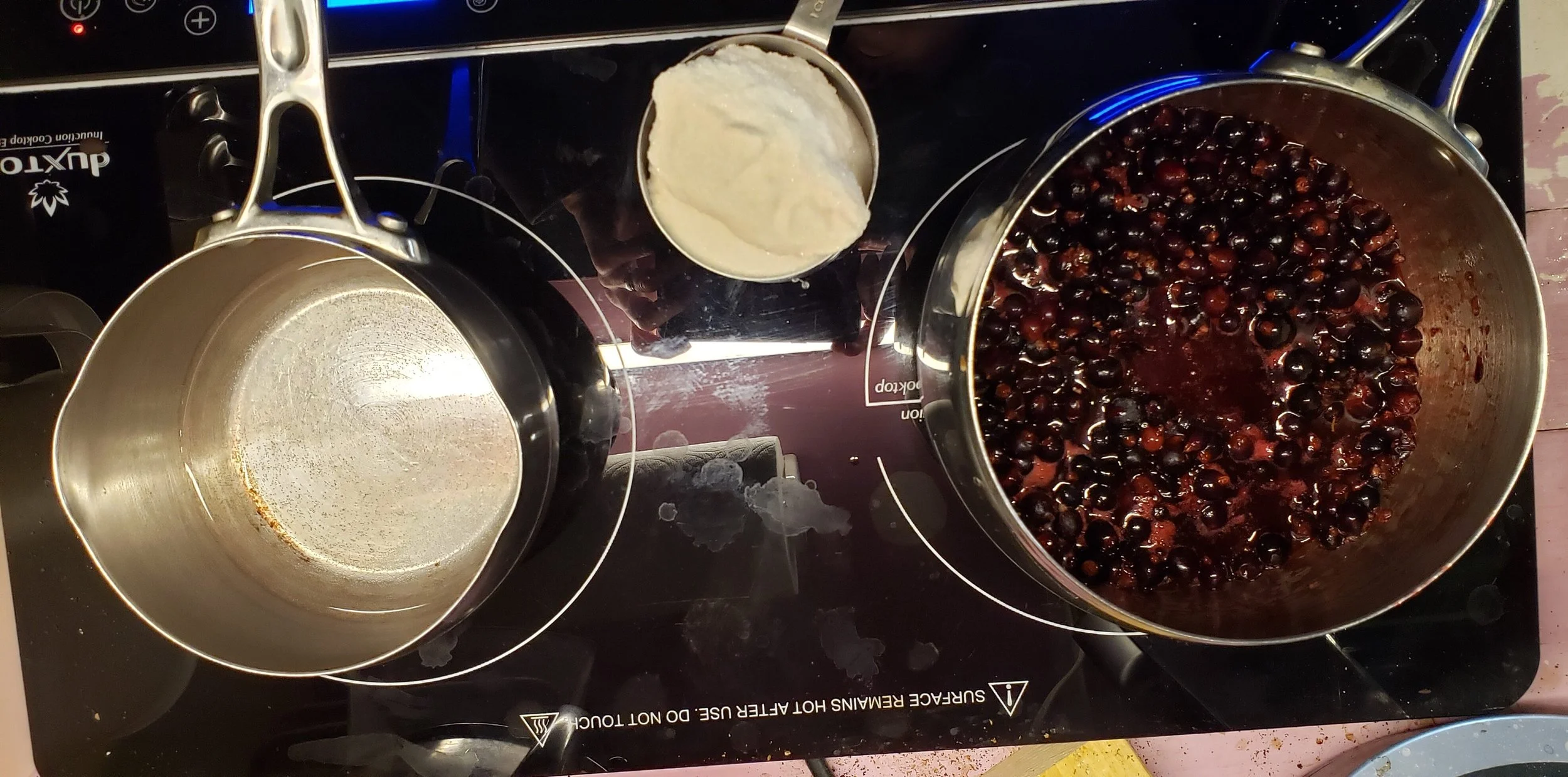 Put the currants in a pan over medium heat. Add about a half cup water to keep them from burning. I am using an induction cooker, but you can the stove top works too. Cook them until they pop and juice is starting to be released.