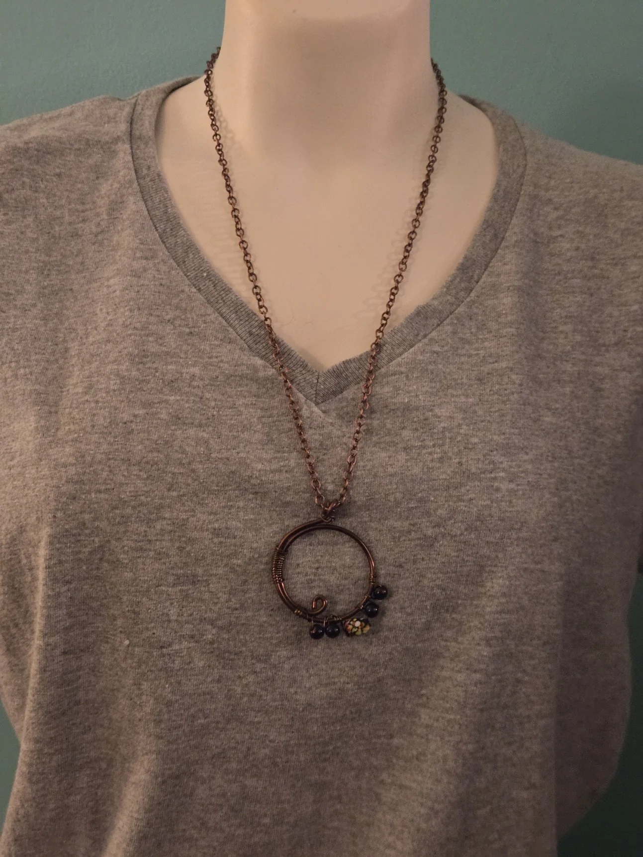 Handmade in my nonsmoking home using Antique Copper colored chain as well as 12 gauge aluminum copper colored wire and 21 gauge half round vintage bronze wire. This necklace features 4 copper colored small beads and a multi colored blown glass bead. It is approximately 24.5 inches long with a lobster claw clasp. Quarter for size. The item picture is what you will receive.